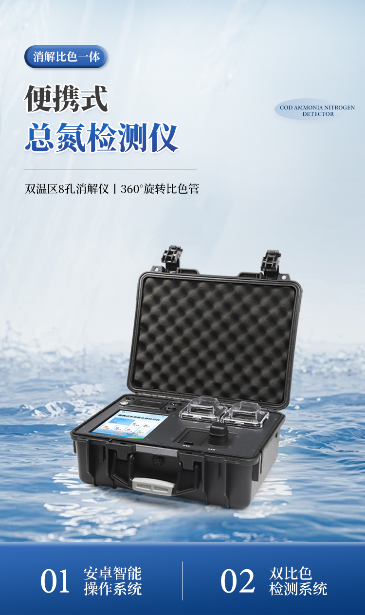 便携式总氮检测仪采用高强度PVC工程塑料手提箱设计,消解检测一体式设计,其中消解模块具备双温区功能,检测部分同时具备360°旋转比色试管检测和比色皿检测,安卓智能操作系统,8英寸高清液晶触摸屏,光纤检测技术,进口光源,内置大容量锂电池,便携多参数水质检测仪具有性能稳定、测量准确、测定范围广、功能强大、操作简单等特点。