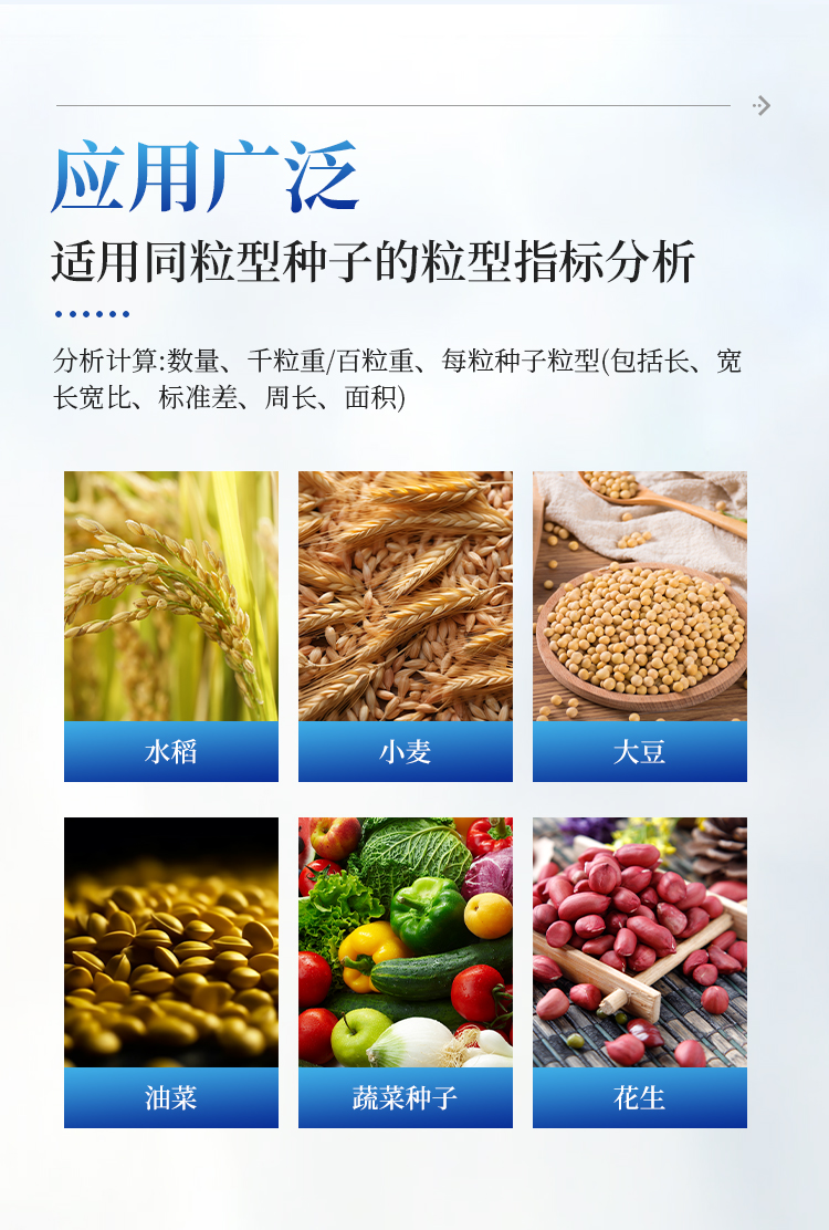 1、适用于玉米,水稻,小麦,大豆、油菜,蔬菜等同粒型种子的粒型指标分析。